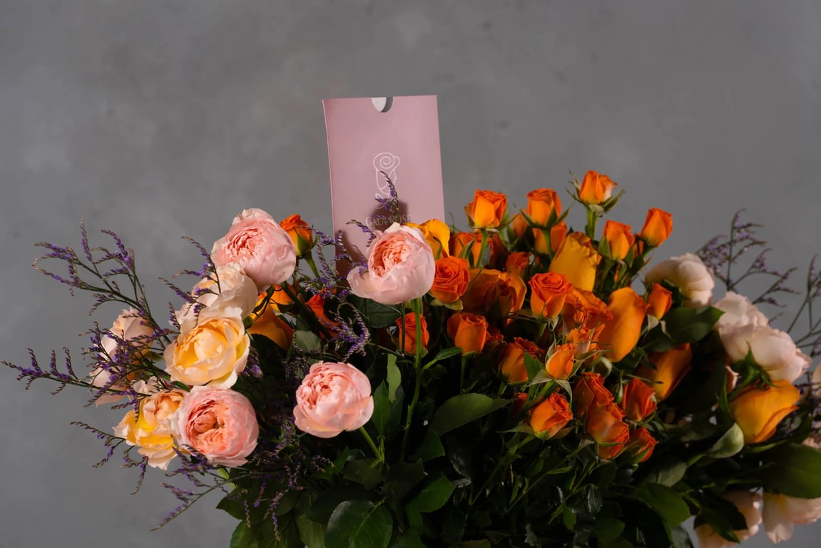 تحتوي الفازة على:- جاردن روز مشمشي، جاردن روز وردي ، روز برتقالي، بيبي روز برتقالي، ليميونيوم بنفسجي،فازة مقاس 20* 20 سم.