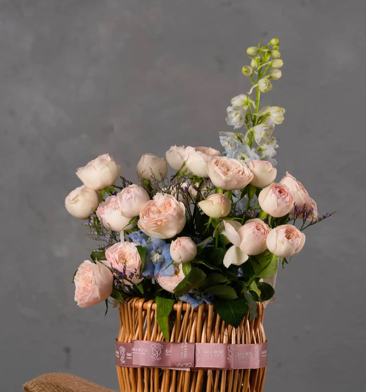 تحتوي السلة على:- ديلفينيوم اللون الازرق، بيبي جاردن وردي ، لومينيوم بنفسجي، سلة مقاس 14*14 سم، ومُزين بشريطة غالا روز، بالون شفاف مثبت بشريطة لون سُكري.