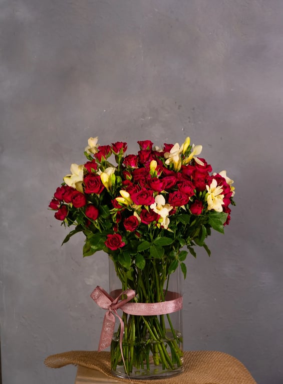تحتوي الفازة على:- بيبي روز فوشي ، فريزا ابيض، مزين ب شريطة غالا روز الخاصة.