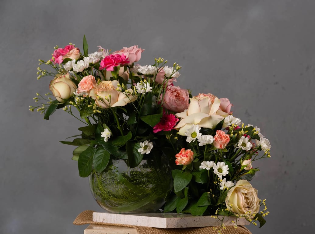 تحتوي على:- كرسانثيمو أبيض ، روز سكري مكس فوشي ، جاردن روز وردي ، بيبي روز فوشي مكس ابيض ، بيبي روز مشمشي ، كارنيشن فوشي ، لومينيوم بنفسجي ، بانكيوم ،استروميريا أبيض ، فازة زجاج شفاف مقاس 18 مثبتة على قاعدة ترافنتينو لون بيج مقاس 30*20