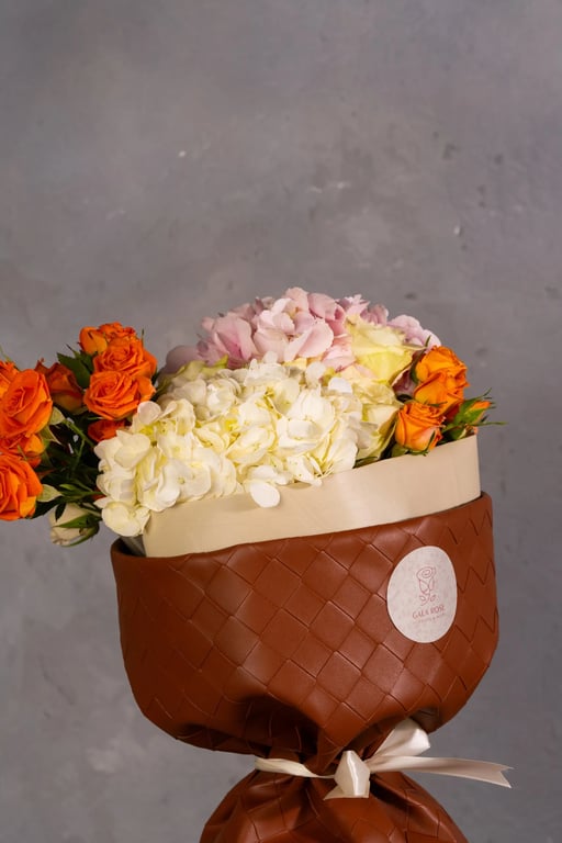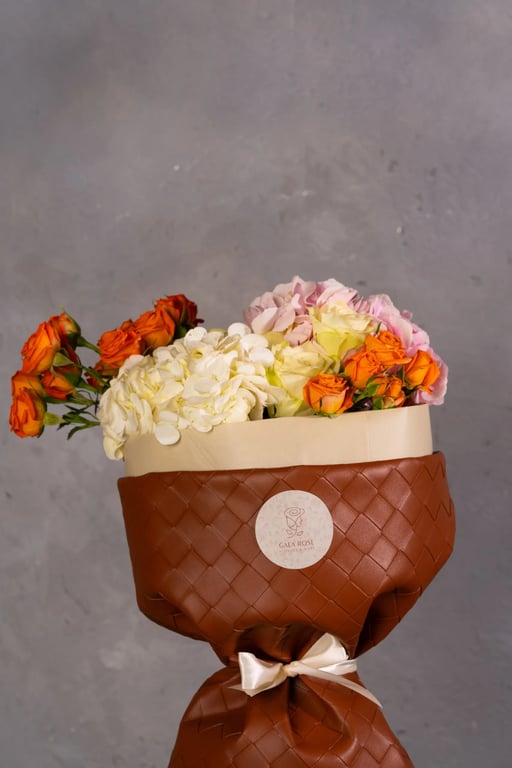 يحتزي التنسيق على:- هايدرنجيا أبيض، هايدرنجيا وردي، بيبي روز برتقالي، مزين بتغليف جلد بني وشريطة سكري.