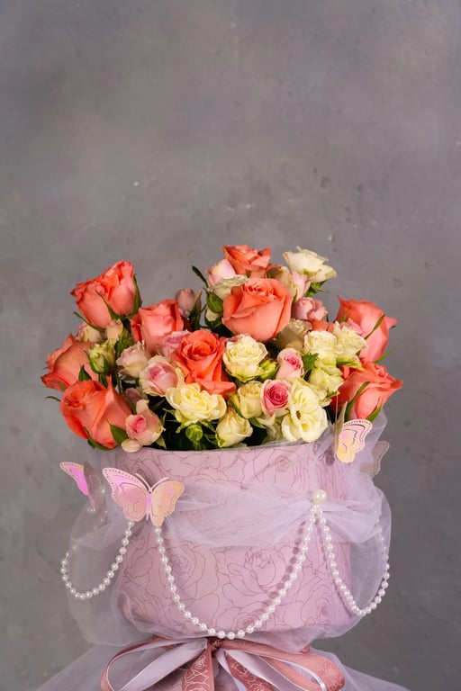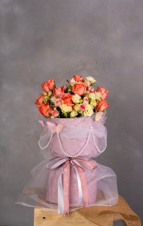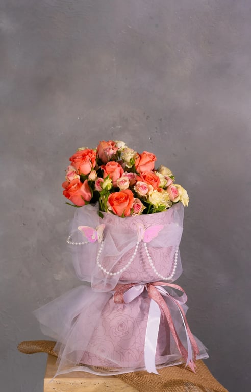 The bouquet contains:- pink rose ,pink rose baby, white rose baby, decorated with Gala Rose packaging, white tulle, bright pink butterfly and pearl ribbon.